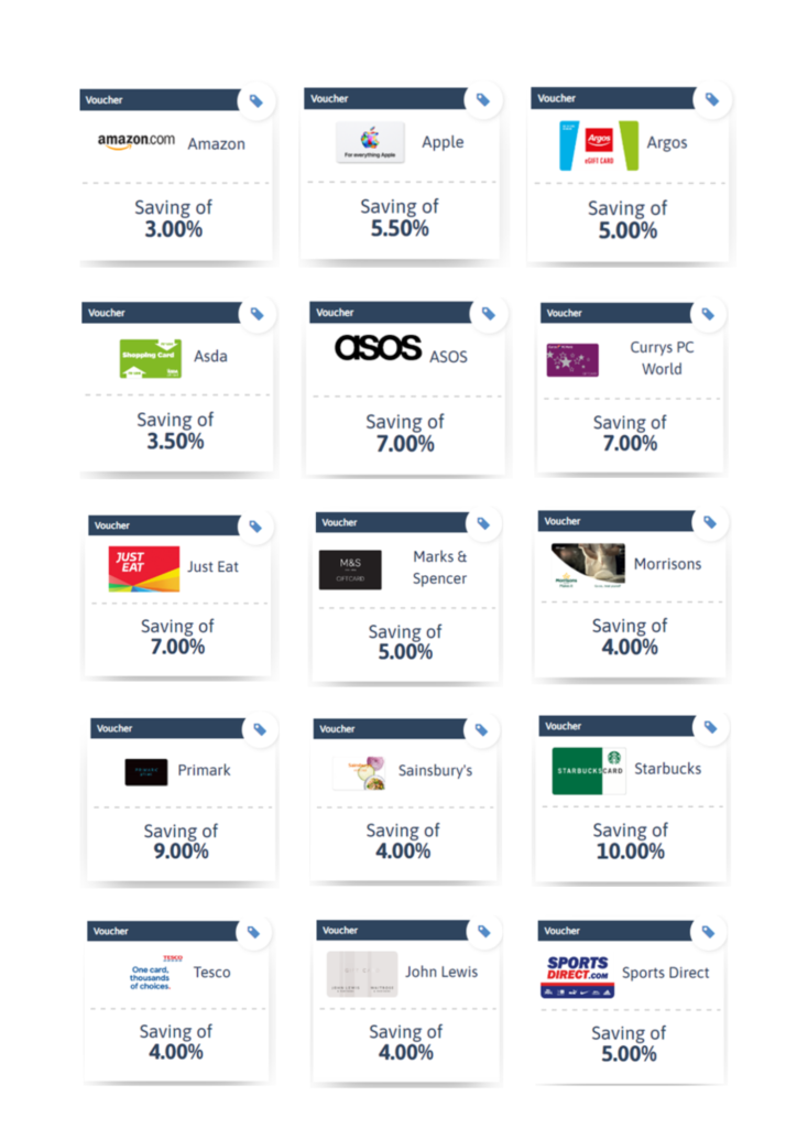 Instant discounts on e-vouchers allowing you to save online or in-store at popular stores such as ASDA, Tesco, Sainsburys, Morrisons, M&S, John Lewis and Waitrose as well as Amazon, Costa, Starbucks, Caffe Nero, Primark and many more.